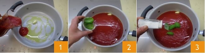 To prepare the pasta ring bake, start with the tomato sauce; heat a non-stick pot with a drizzle of oil and the garlic clove 1. Let it brown briefly, then pour in the tomato puree along with the basil leaves 2; add salt to taste 3 and cook over very low heat for 30 minutes.