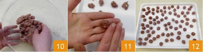 Mix vigorously with your hands until everything is well combined 10. Make small balls weighing 5 g (0.18 oz) each 11 and continue until the mixture is finished: with our doses, you should obtain 80 meatballs 12.
