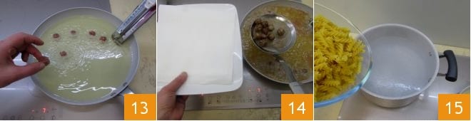 Heat a large pan with oil for frying and check that the temperature reaches 350°F-355°F with a kitchen thermometer. Fry the meatballs a few at a time 13, then, when they are nicely golden, drain them with a slotted spoon and place them on a sheet of absorbent paper 14. When the sauce is ready, turn off the heat and remove the garlic. Bring salted water to a boil in a large pot and cook the fusilli for 7-8 minutes 15.