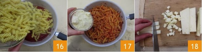 Drain the pasta, then pour it directly into the sauce 16; mix with a kitchen spatula, then add 100 g (3.5 oz) of grated cheese 17, keeping a small amount aside for later. Cut the Asiago into cubes 18