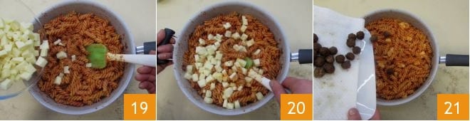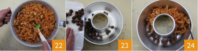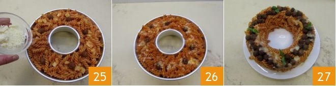 and mix 22. Now you can proceed with assembling the ring: place the remaining meatballs in a greased 10-inch ring mold, arranging them evenly next to each other 23. Then distribute the fusilli with the sauce 24 up to the edge of the mold,