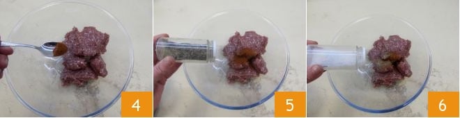 In the meantime, prepare the meatballs: in a bowl, place the ground meat, sweet paprika 4, and season with salt and pepper (5-6).
