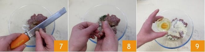 Add the grated nutmeg 7, thyme leaves 8, the whole egg, and 50 g (1.76 oz) of grated Parmesan 9.