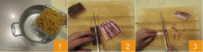 To prepare the pasta salad with pears, bacon, and walnuts, you can first start cooking the pasta 1. Meanwhile, cut the bacon into slices, then into strips 3,