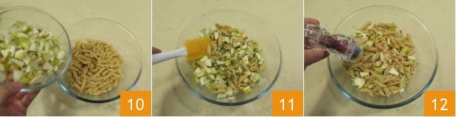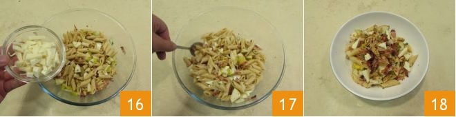 and add it to the bowl with the pasta 16 along with all the dressing. Mix well so that all the ingredients are combined 17 and your pasta salad with pears, bacon, and walnuts will be ready to serve! 18