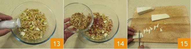 Salt to taste 13, then also add the crispy bacon and chopped walnut kernels 14. Finally, cut the Pecorino into chunks 15