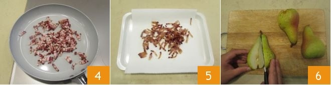sear it in a non-stick pan for about 3 minutes over high heat (without adding extra fats) and once it's ready, when it becomes nice and crispy, place it on a tray lined with paper towels 5. Then wash the pears and cut them in half first 6,