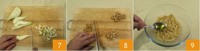 then core them and, without peeling, cut them into wedges, and finally into cubes 7. Roughly chop the walnuts 9 and once the pasta is al dente, drain it and transfer it into a large bowl. Pour in a tablespoon of oil 9 and mix so that the pasta doesn't stick together as it cools. Let it cool down.