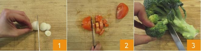 To prepare the pasta soup with chickpeas and broccoli, start by slicing the white part of the spring onion 1, then wash and dice the tomato into medium-sized pieces 2. Remove the broccoli florets 4 and rinse them.