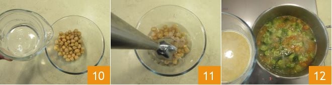 In a separate bowl, pour the remaining 7 oz of chickpeas and add the 3.5 oz of water set aside 10, then blend everything with an immersion blender 11. After the 10 minutes of cooking the soup, add the chickpea puree thus obtained 12.