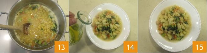 Cook everything for another 5-8 minutes, taking care to remove the bay leaf, before adding the pasta, cooking it for 5 minutes 13. Stir occasionally and, once ready, serve your soup with another drizzle of oil for each plate 14. The pasta soup with chickpeas and broccoli is ready to be enjoyed piping hot 15!