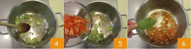 In a large pot, pour a drizzle of oil and gently sauté the spring onion over low heat, stirring often with a wooden spoon 5. After about 1 minute, you can add the diced tomato 6 and the bay leaf (fresh or dried) 6,