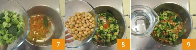 the broccoli florets 7 and 7 oz of pre-cooked chickpeas, drained from their preserving water 8. Mix everything and cook over medium heat: after a few minutes, add some water, setting aside just 3.5 oz of the total amount 9. Salt to taste and cook the soup over medium heat for about 10 minutes.
