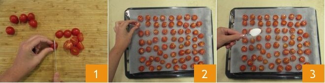 To prepare the pasta with almond pesto and confit cherry tomatoes, start with the latter. Wash them, cut them in half 1, and place them on a baking sheet lined with parchment paper, with the cut side facing up 2. Sprinkle with sugar 3, add salt