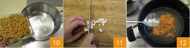 Cook the pasta for the time indicated on the package 10 and in the meantime cut the 'primo sale' cheese into cubes 11. Then transfer the pesto to another pan and dilute it with a ladle of cooking water 12;