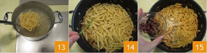 as soon as the pasta is al dente, drain it 13 and transfer it into the pan. Add thyme leaves 14, Taggiasca olives 15, and mix everything together. You can optionally top with more Parmesan to make the pasta even more flavorful and inviting.