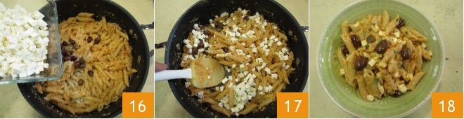 Add the cubed 'primosale' cheese 16, mix once more 17, and serve your pasta with cherry tomato and almond pesto 18.