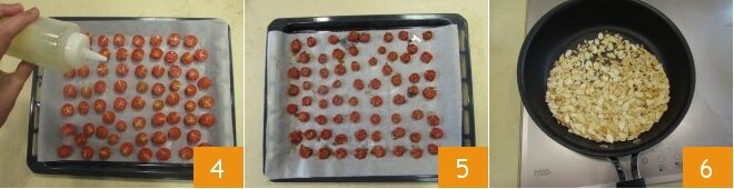 and drizzle everything with a bit of oil 4. Bake in a preheated fan oven at 250°F for about 2 hours, then take them out of the oven 5 and let them cool slightly 5. Meanwhile, toast the almonds over low heat for about 4 minutes until they are nicely golden 6; then place a pot filled with water on the stove, salted to taste, which will be used for cooking the pasta.