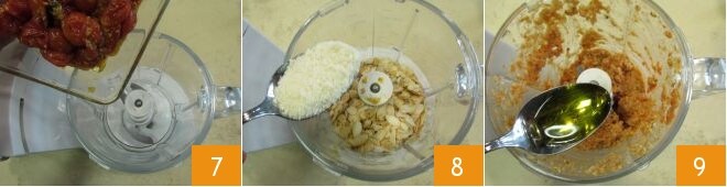 As soon as the cherry tomatoes are cool, transfer them to a blender cup 7, add the almonds, grated Parmesan cheese 8, and blend everything. Then add the oil 9, a pinch of pepper, and blend again. Once you have obtained a homogeneous mixture, set your cherry tomato pesto aside.