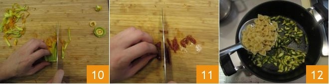 remove the pistil and cut them into thin strips; set aside 10. Also, cut the cherry tomatoes, previously drained of their preserving oil, into strips. Once the pasta is al dente, drain it and transfer it directly into the pan with the asparagus 12.