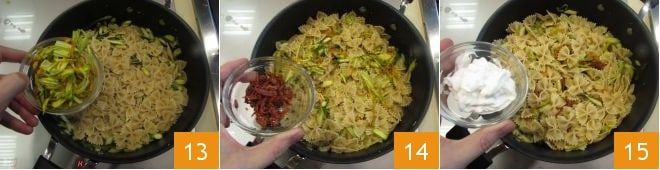 Then add the zucchini flowers 13, the cherry tomatoes 14, and, with the heat off, finish with the stracciatella 15.