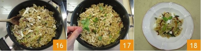 Mix everything with a wooden spoon 16, add fresh basil leaves 17, and serve your pasta with asparagus and zucchini flowers hot or warm 18!