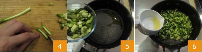 To prepare the pasta with asparagus, stracciatella, and zucchini flowers, start by cleaning the asparagus. Put a pot of water on the stove to later cook the pasta (salt as desired when boiling); then focus on the dressing: remove the end of the asparagus stalks 1 and peel the outer part with a peeler 2. Using a knife, cut the end of the asparagus into pieces 3