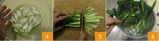 To prepare pasta with cooked puntarelle, start by cleaning the latter. Wash them well under running water, cut off the end of the stem with a knife; take only the central leaves, the smaller and tender ones 1, setting aside the others for a moment. Using a small knife, detach them from the stem 2 and cut them into julienne strips 3.