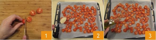 To prepare the pasta with fennel, start by preparing the confit cherry tomatoes. Wash the cherry tomatoes, cut them in half 1, and place them on a baking sheet lined with parchment paper, positioning them cut side up. Salt, pepper, and sprinkle them first with brown sugar 2, then oregano and oil 3. Cook in a preheated static oven at 340°F for 50 minutes and in the meantime, work on making the pesto.