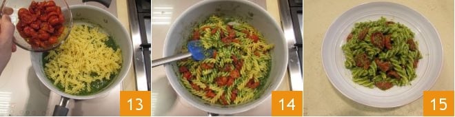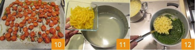 At this point, the confit cherry tomatoes will be ready, remove them from the oven 10, cook the pasta 11, and drain it al dente. Transfer them to the pan where you poured the fennel pesto 12.