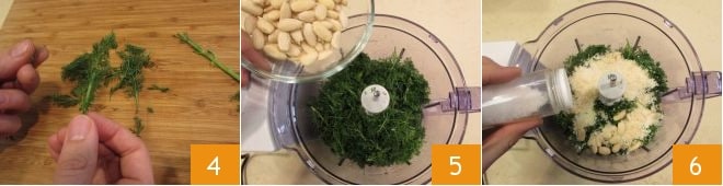 Wash the fennel as well, pat it dry with a paper towel, and take only the leaves, removing the stem 4. Then, transfer them to a blender, add the peeled almonds 5, grated cheese, a pinch of salt 6, and pepper.