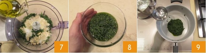 Finally, pour in the oil 7 and blend everything until you get a homogeneous mixture 8. At this point, place a pot filled with water on the stove (which will be used for cooking the pasta) and bring it to just below boiling, then salt it. Transfer the fennel pesto into a large pan (this will make it easier to dress the pasta), without turning on the heat. Dilute it with a ladle of hot water 9.