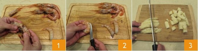 To prepare the pasta with fish meatballs, start by cleaning the shrimp (for more details on how to clean them, you can refer to our cooking school: How to clean shrimp) and rinse them under plenty of running water. Now detach the head from the tail by holding it between your fingertips and gently pulling it off 1. Also, remove the legs, then discard the shell and tail. Once this operation is complete, use a knife to cut along the back of the shrimp tail and remove the intestine, being careful not to break it 2: set the shrimp aside. Proceed by removing the crust from the bread and cutting the crumb into cubes 3.