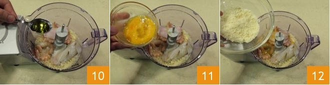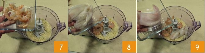 Add the cleaned shrimp tails 7, the cod fillet 8, and the plaice 9 to the mixer. You can coarsely chop the fish or add them whole: working them with the mixer will blend the tender flesh evenly.
