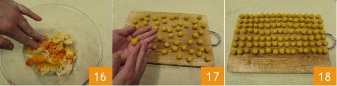 Mix the ingredients well by vigorously stirring them with your hands 16. When they are well combined, take about 0.21 oz of mixture and create small meatballs 17: you will obtain a total of 105, which you can arrange on a tray 18.