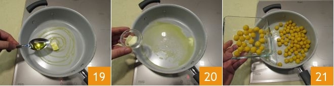 At this point, take a non-stick pan with a wide bottom and pour in oil and butter 19: when the butter is melted and the oil is hot, brown a clove of garlic 20. Once golden, remove it. Now add the meatballs 21: brown them for 4-5 minutes on high heat, making sure they do not stick to the bottom of the pan.