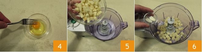Bring hot water to a boil in a large pot and when it reaches a boil, salt to taste: this will be used for cooking the pasta. Then beat the egg in a small bowl 4 and take a mixer in which you will put the bread crumbs 5 and the peeled garlic, from which you have also removed the inner germ 6.