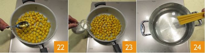 Deglaze with brandy 22 and let it evaporate. Then add the fresh liquid cream 23, seasoning with salt and pepper. Let it cook this way for about 10 minutes on medium heat. In the meantime, boil the spaghetti 24,