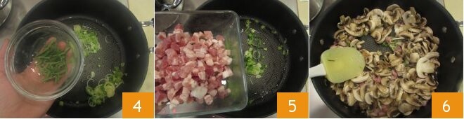 and let it brown over low heat for 2-3 minutes, then season with the rosemary leaves 4. At this point, also add the bacon 5 and mushrooms 6 and cook for 5-6 minutes.