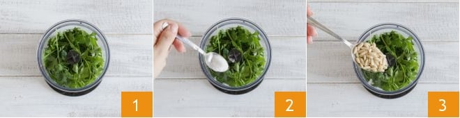To prepare the pasta with parsley pesto and speck, bring some water to a boil and salt it to cook the pasta. Start with the parsley pesto: wash the bunch of parsley, remove the leaves and place them in a blender 1; then pour in the salt 2, the pine nuts 3