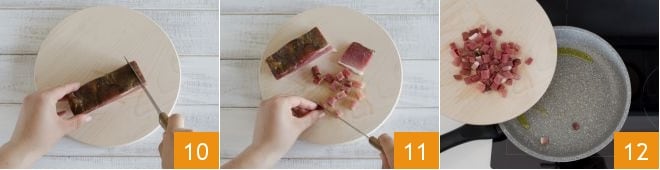 and in the meantime take the speck, cut it into slices about 0.4 inches thick 10 and then into cubes 11. Heat 1.5 tablespoons of oil in a pan, add the speck 12.