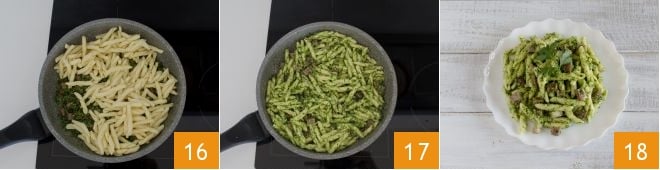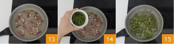 Sauté for a few minutes 13, then add the pesto 14. Stir quickly and turn off the heat 15.