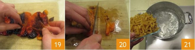 Cut the bell pepper in half and remove the skin 19, then cut it into strips 20. Meanwhile, the water for the pasta will have come to a boil, so add the fusilli 21 and cook them for the time indicated on the package.