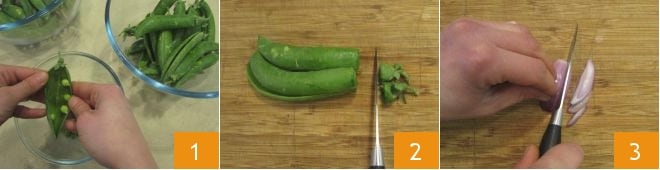 To prepare the pasta with pea pods, first preheat the oven to 464°F in fan mode. Wash the whole pods, then shell the peas and set aside the pods 1, from which you will later remove the stem 2; in total you will need 100 g (3.5 oz) of shelled peas and 200 g (7 oz) of pods. Peel the shallot and slice it thinly 3.