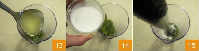 Add a ladle of the cooking water from the pods 13, add the fresh cream 14 and blend with an immersion blender 15 to turn them into cream, then adjust the salt.