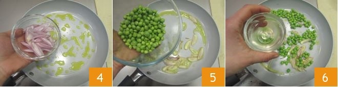 Heat a drizzle of oil in a large pan, add the shallot 4 and let it fry gently for a few minutes. Add the peas 5 and let them brown for a couple of minutes, then deglaze with the white wine 6 and continue cooking for about 10 minutes.