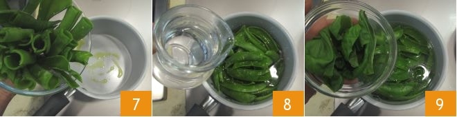 In the meantime, pour a drizzle of oil into a high-sided saucepan, add the pods 7 and cover them with water 8. Add the basil leaves 9, salt, cover with a lid and let simmer for 15-20 minutes.