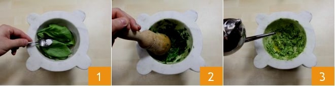 To prepare the pasta with pesto and shrimp, start by preparing the pesto (for the complete procedure you can check our Genoese pesto (Pesto alla genovese) recipe): carefully clean the basil leaves with a clean cloth (if you are not sure of the origin of the basil, you can gently dip the leaves in a bowl filled with cold water to rinse them. Then let them dry completely on a clean cloth. Then take a mortar and crush the peeled garlic with some coarse salt: when you have obtained a creamy mixture, add the basil leaves along with more coarse salt 1. With the pestle, crush the basil by rotating the pestle and mortar in opposite directions 2: a bright green liquid should come out of the leaves. Add pine nuts and cheese while continuing to crush. Finally, add the olive oil in a thin stream 3, continuing to mix the ingredients well with the pestle until you obtain a homogeneous sauce. Set the pesto aside.