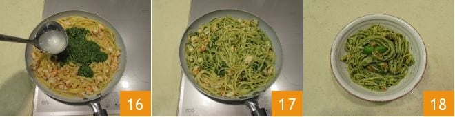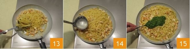 and when the pasta is still slightly al dente, drain it (keeping aside at least 2-3 ladles of cooking water) and add it directly to the pan with the shrimp 13; add a ladle of pasta cooking water 14 to finish cooking and prevent it from drying out too much: let it cook, stirring for a few moments until completely absorbed. When ready, turn off the heat and add the pesto 15,