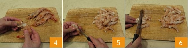 Then bring the pasta water to a boil and when it reaches boiling point, salt it. In the meantime, focus on cleaning the shrimp (for more detail, you can check our cooking school article on How to clean shrimp). Take the shrimp and rinse them quickly under plenty of cold water. Then gently detach the head 4, and remove the legs and shell, along with the tail. Proceed by cutting along the back and using a small knife, remove the intestine 5, being very careful not to break it. At this point, the shrimp are ready: cut them into small pieces 6 and set them aside.